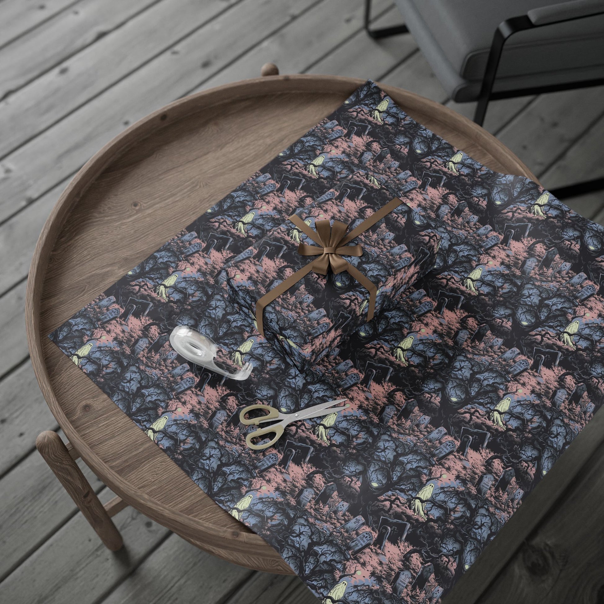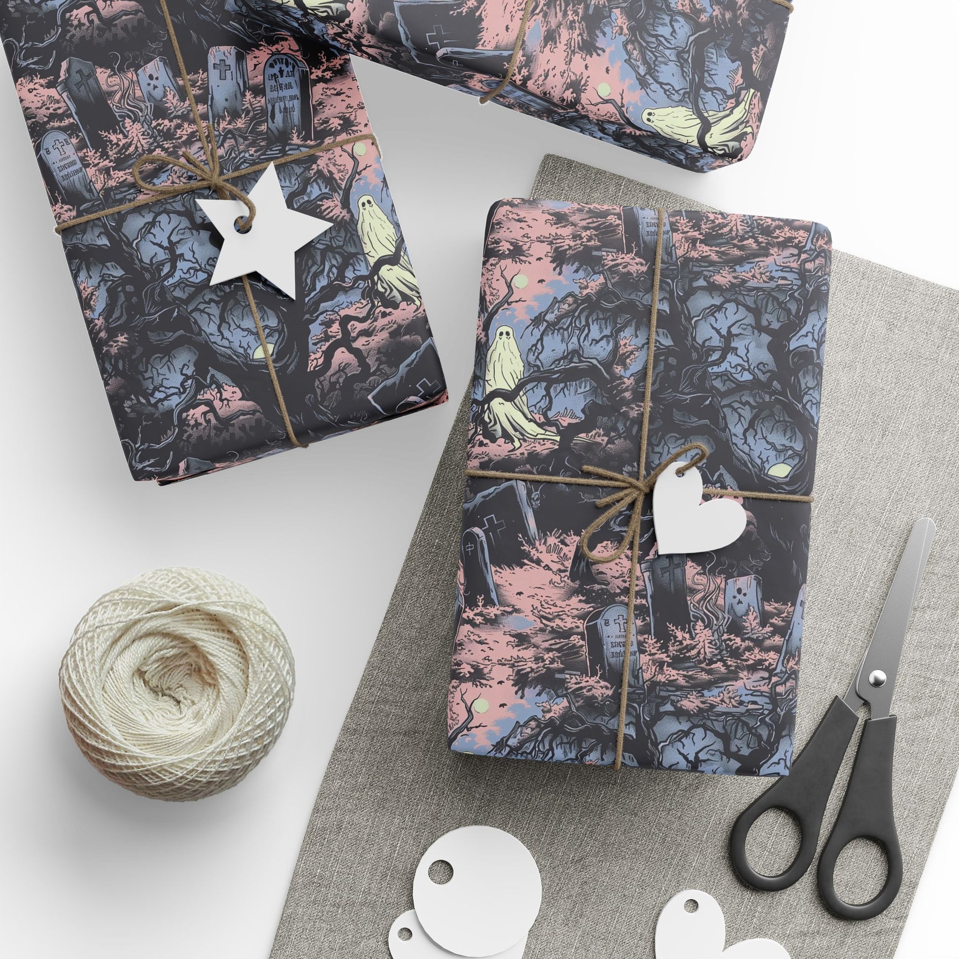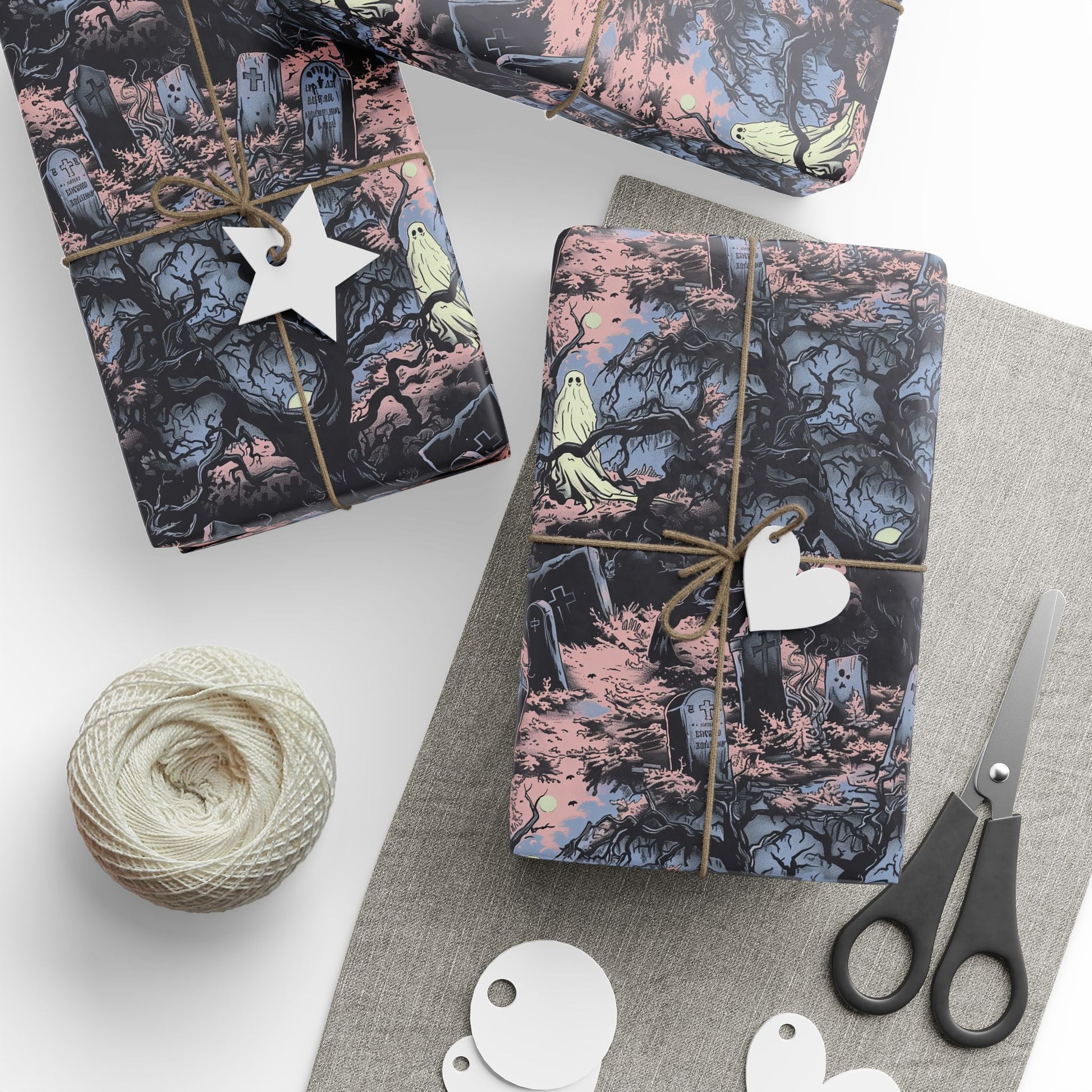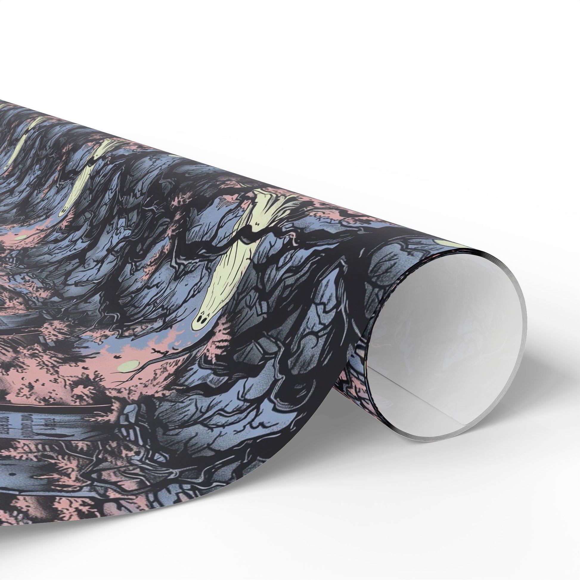 The scene is drenched in cool blue and eerie pink tones, creating a haunting, spooky Halloween atmosphere.