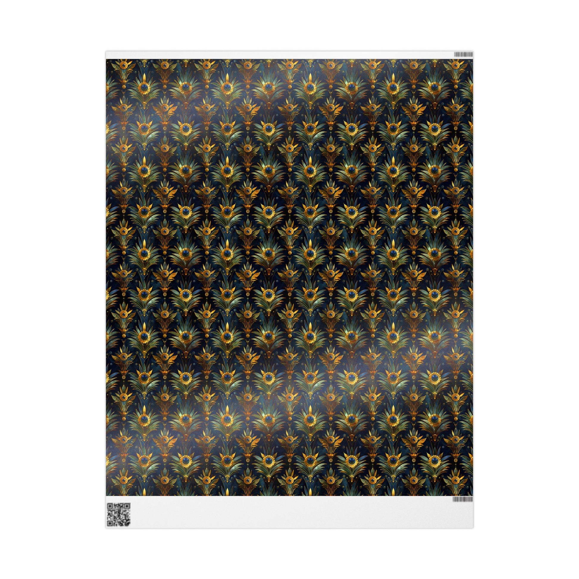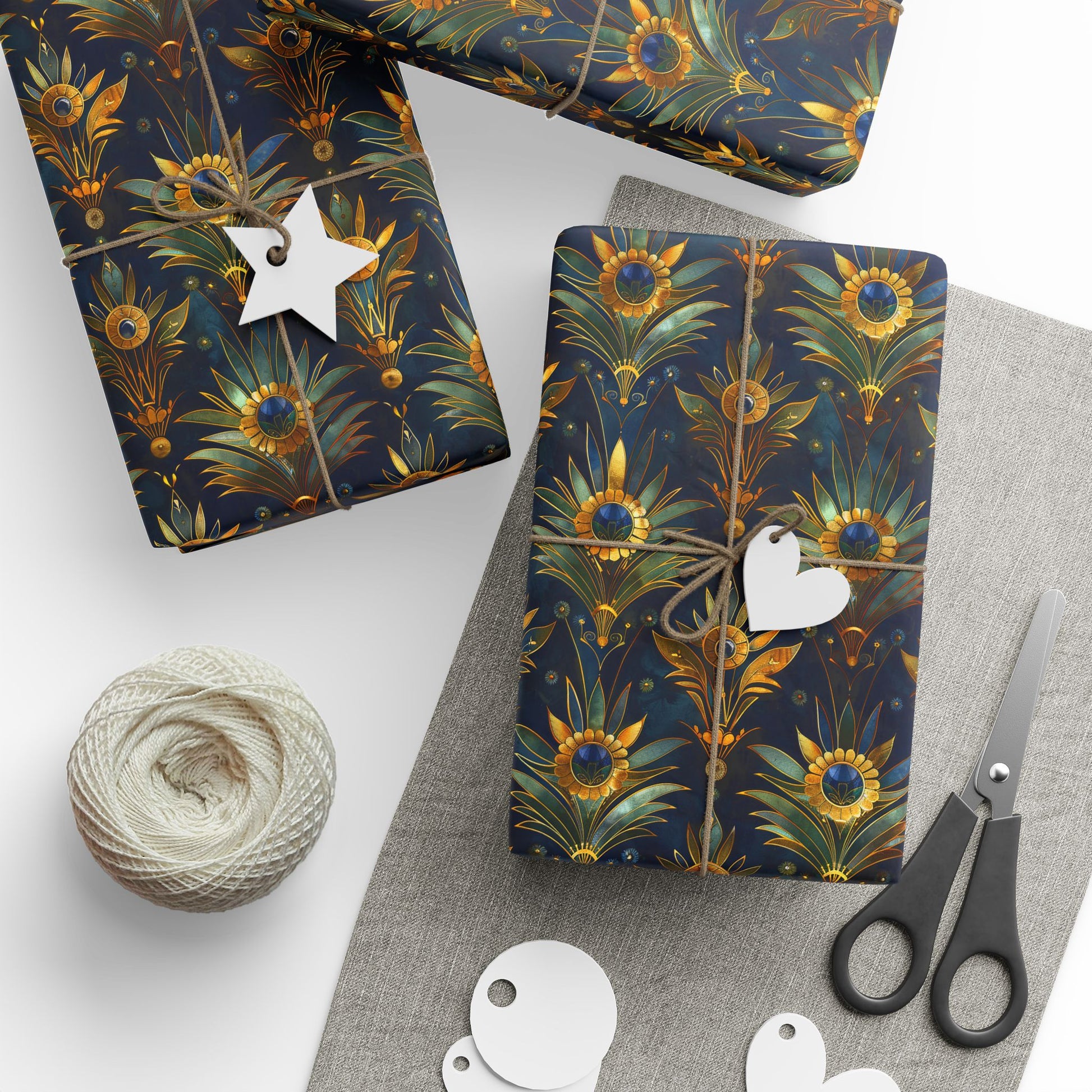 Luxury Art Deco Wrapping Paper – Gold Petal and Blue Gem Floral Pattern