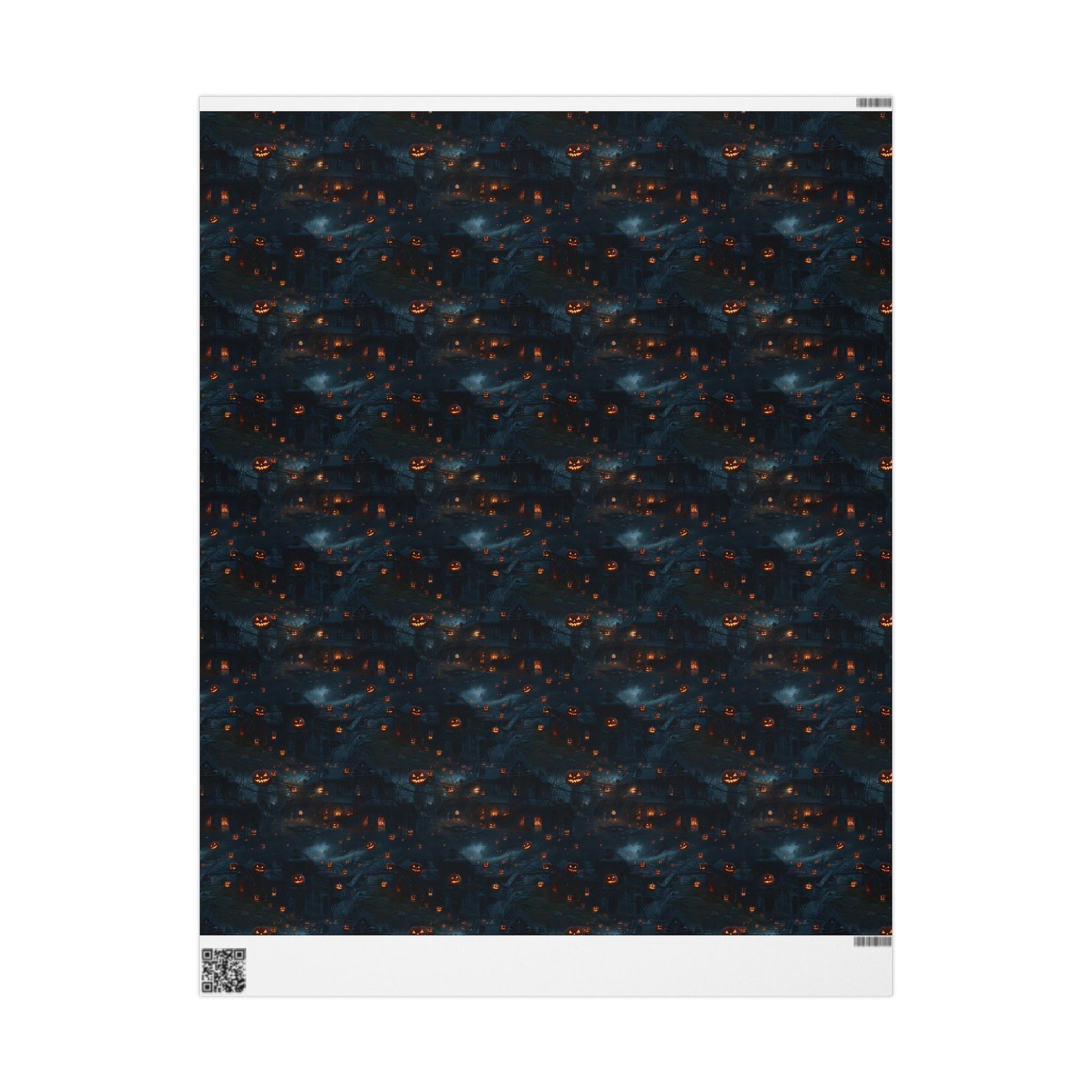 Glowing jack-o’-lanterns float through the night sky, casting an eerie light over a crumbling haunted house.