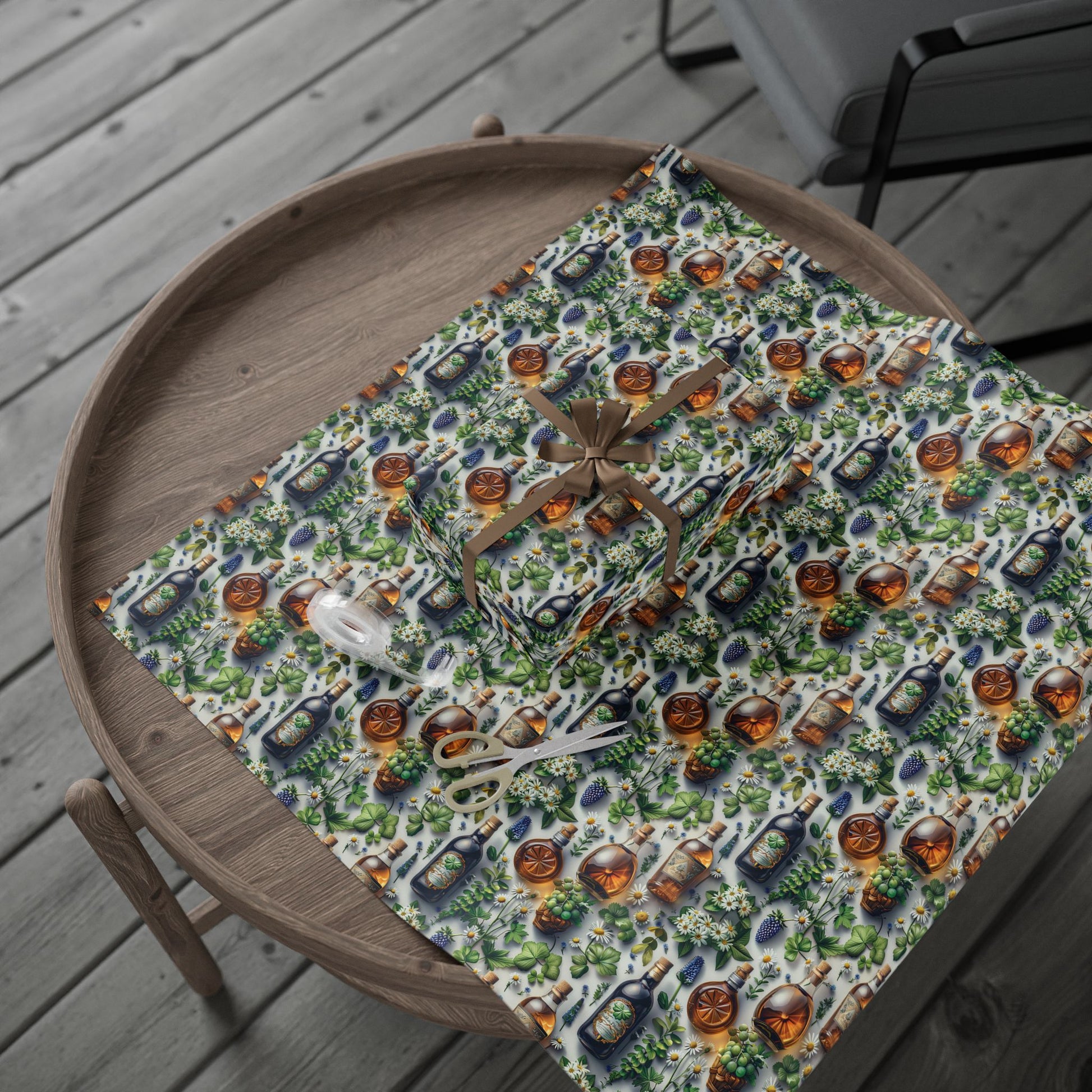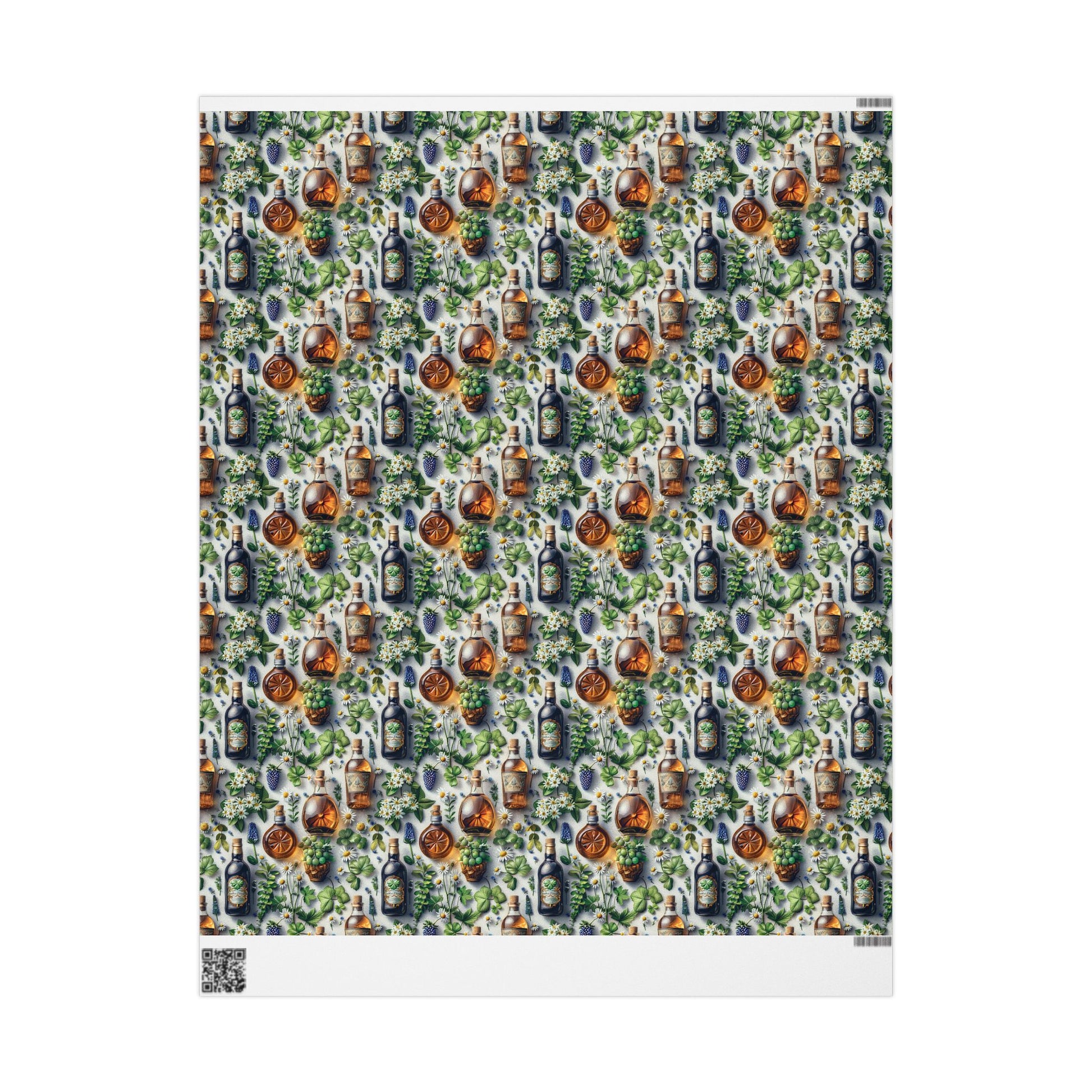 Photorealistic wrapping paper featuring bottles of herbal liqueurs, wildflowers, berries, and greenery.