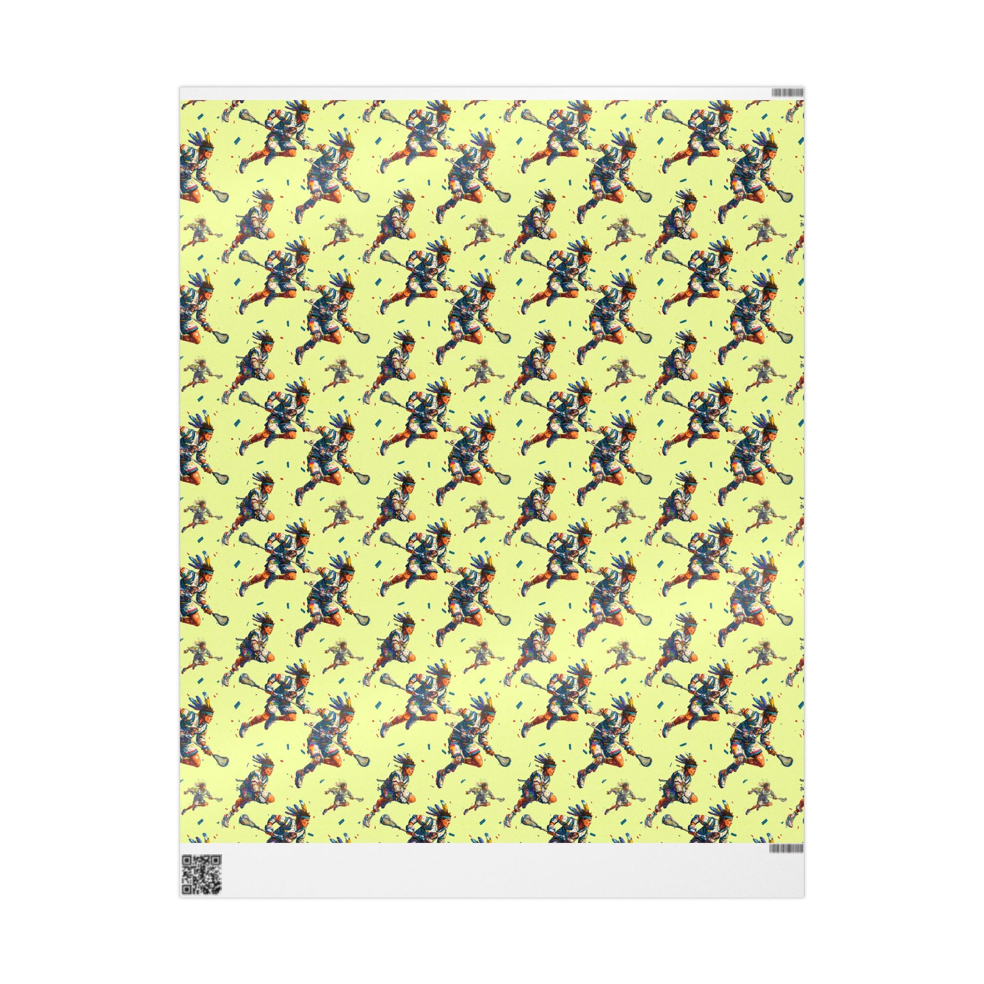 A dynamic pattern of male lacrosse players mid-stride, their energy captured in bold strokes of color and motion.